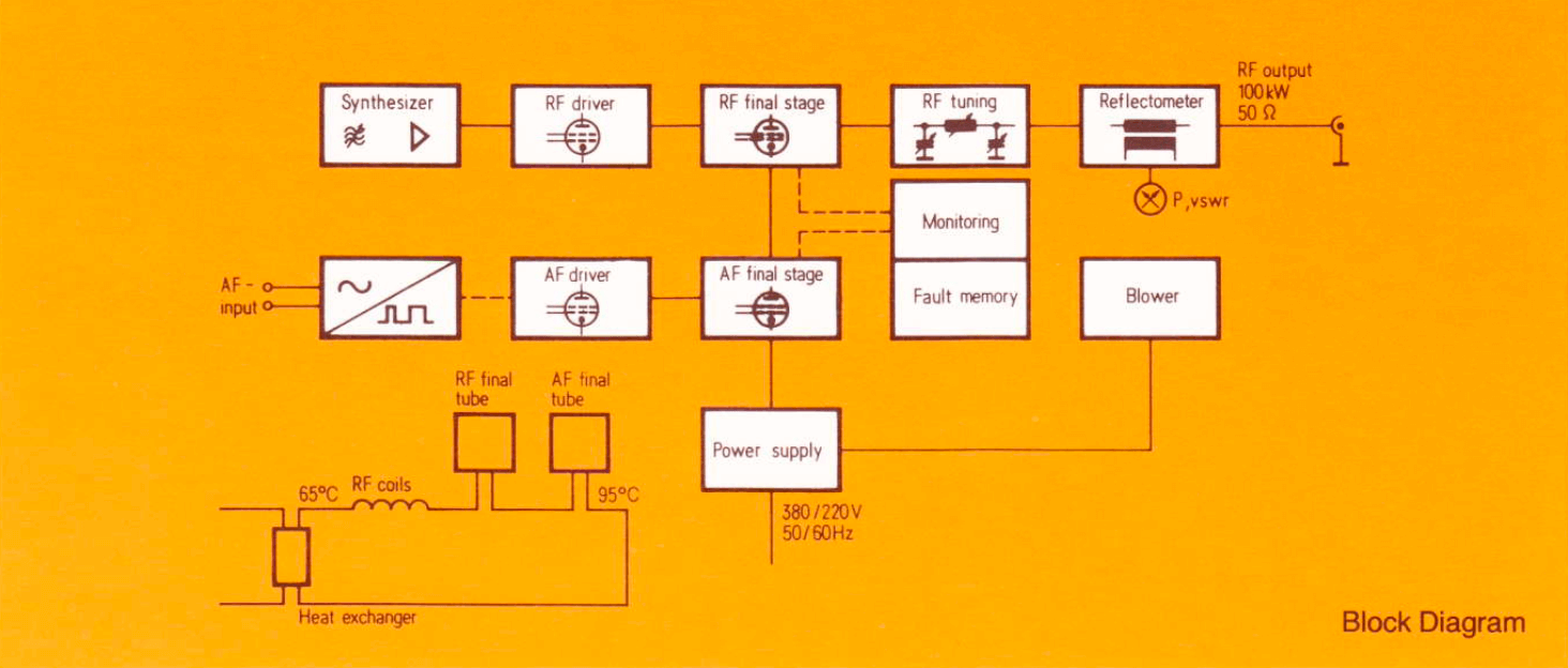 The Siemens HF Transmitter type WR Send 50 K-04 with amplitude modulation operates with a carrier power of 50 kW. Being equipped with a synthesizer, it can be tuned to any frequency within the broadcasting bands of the frequency range.